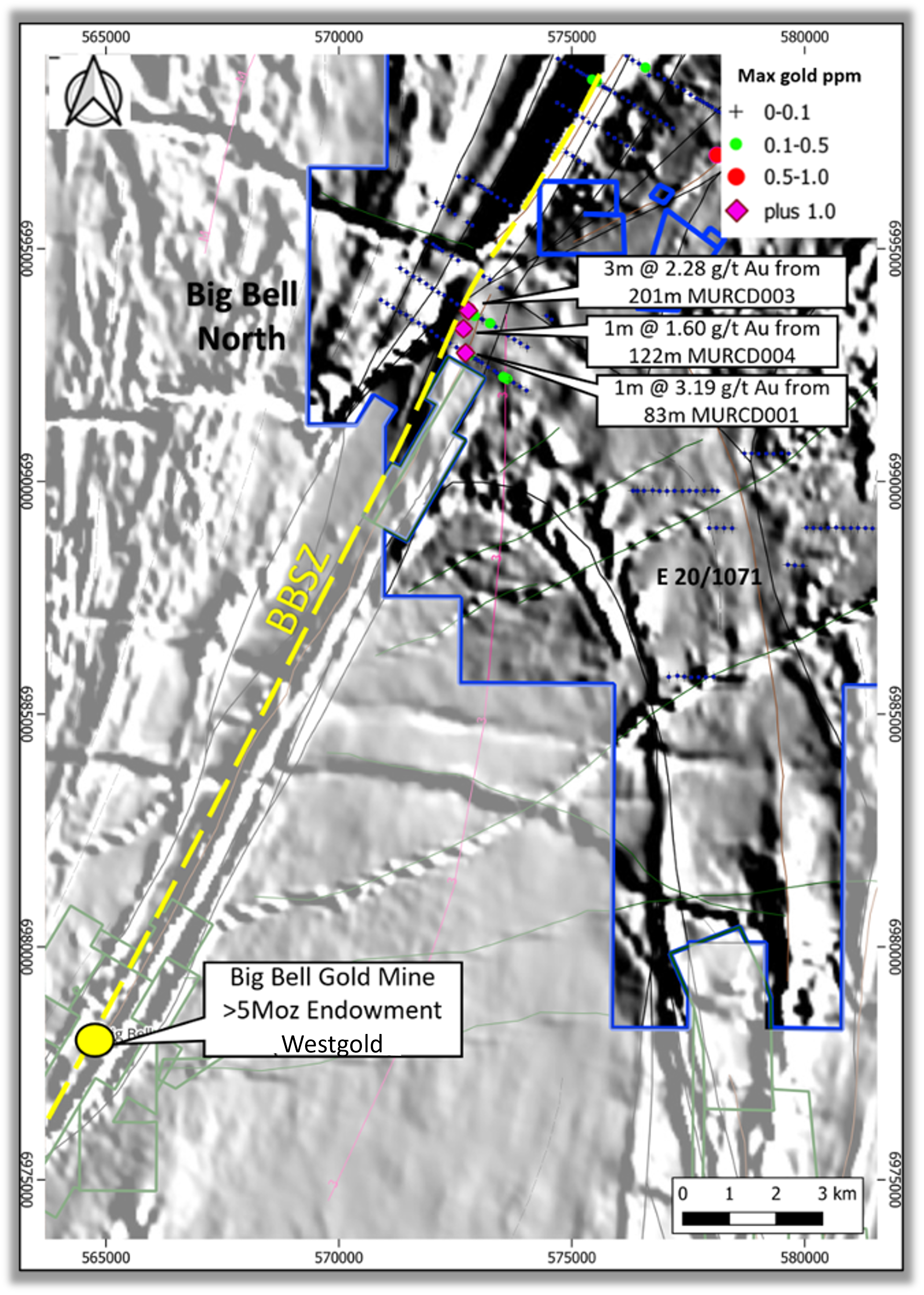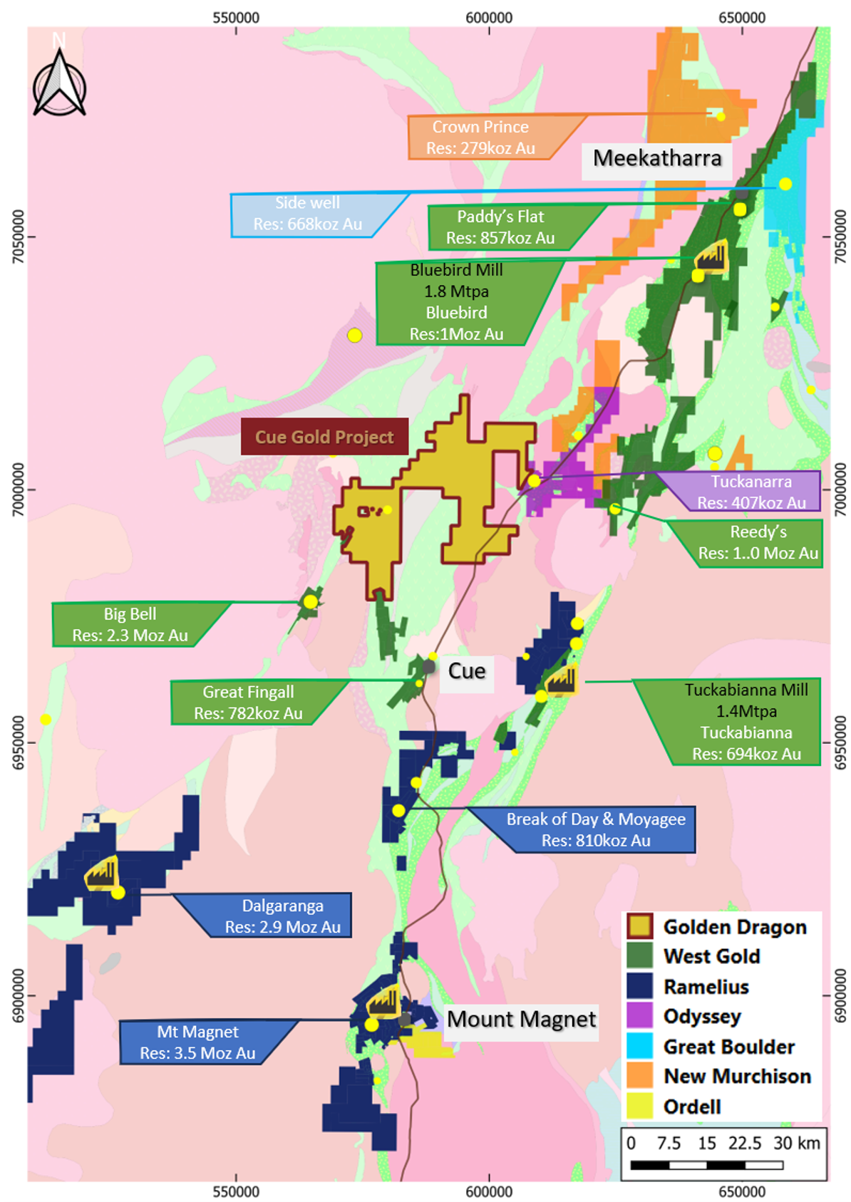 The Cue Project is directly along strike from the world class Big Bell gold mine operated by Westgold (ASX:WGX). Big Bell has produced over 3Moz and currently has a mineral resources of 24.4M tonnes at 3.0 g/t Au for 2.3 Moz of Au.