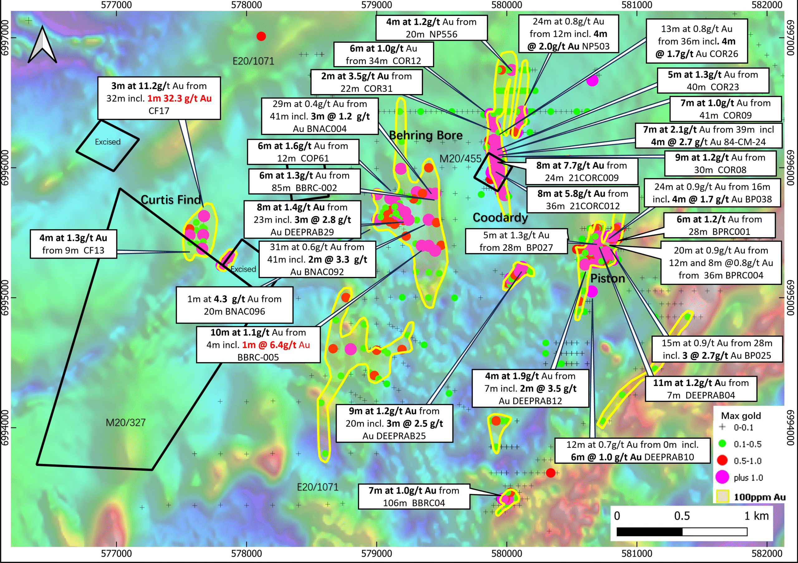 Behring Bore prospect area, over TMI showing maximum gold and significant intersections from historical drilling