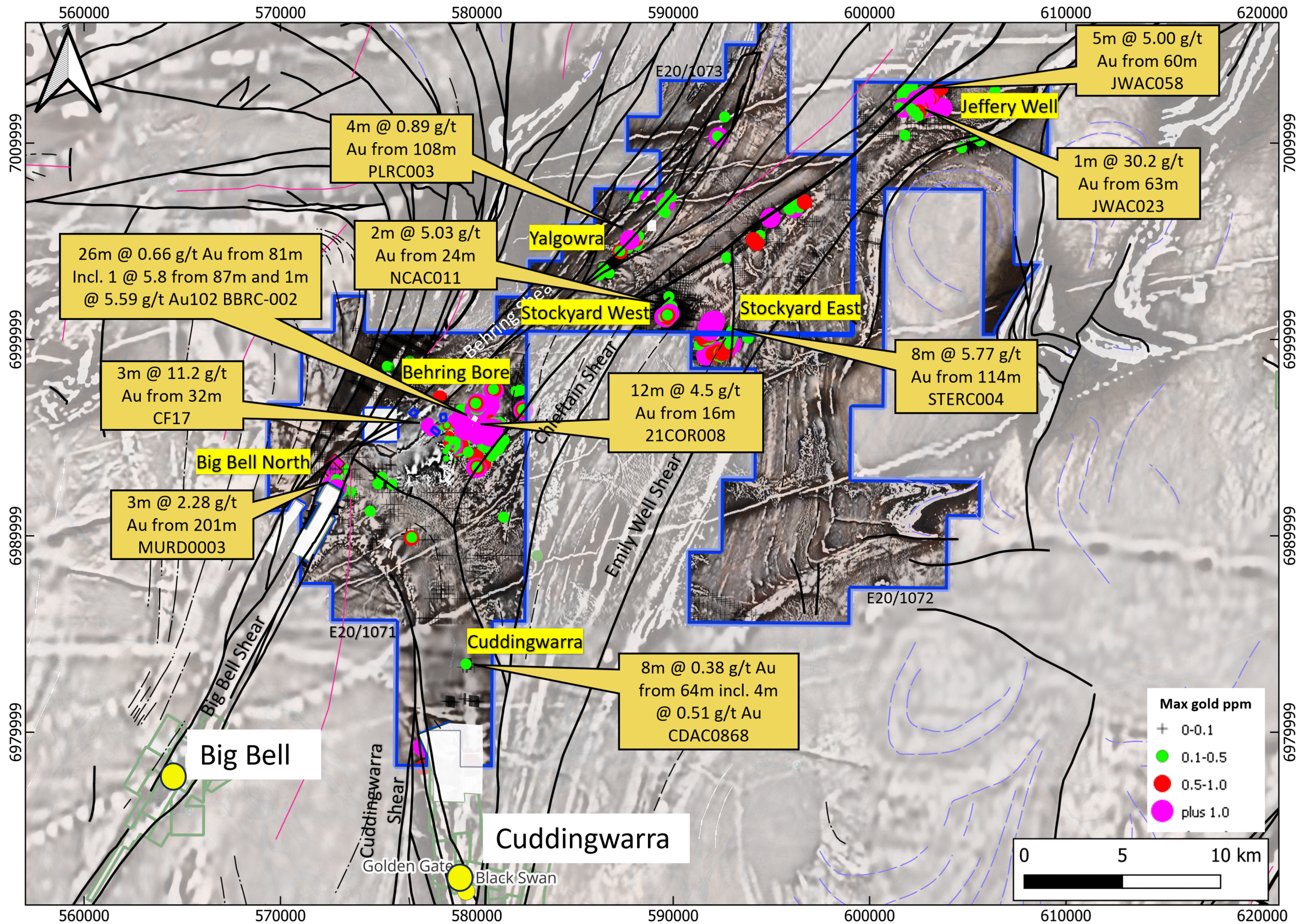 Results of the drilling undertaken on the project to date indicates a correlation of anomalous gold results with the major structural breaks. Large parts of the project are covered by deeper transported cover where there has been minimal testing to date. Golden Dragon has identified a number of structurally controlled targets, some of which correspond with old workings, dry blowing patches and highly anomalous gold results in drilling. Targets that Golden Dragon consider advanced and worthy of follow up exploration are Stockyard East, Stockyard West, Big Bell North, Jeffery Well, Cuddingwarra, Behing Bore and the Yalgowra Prospects.